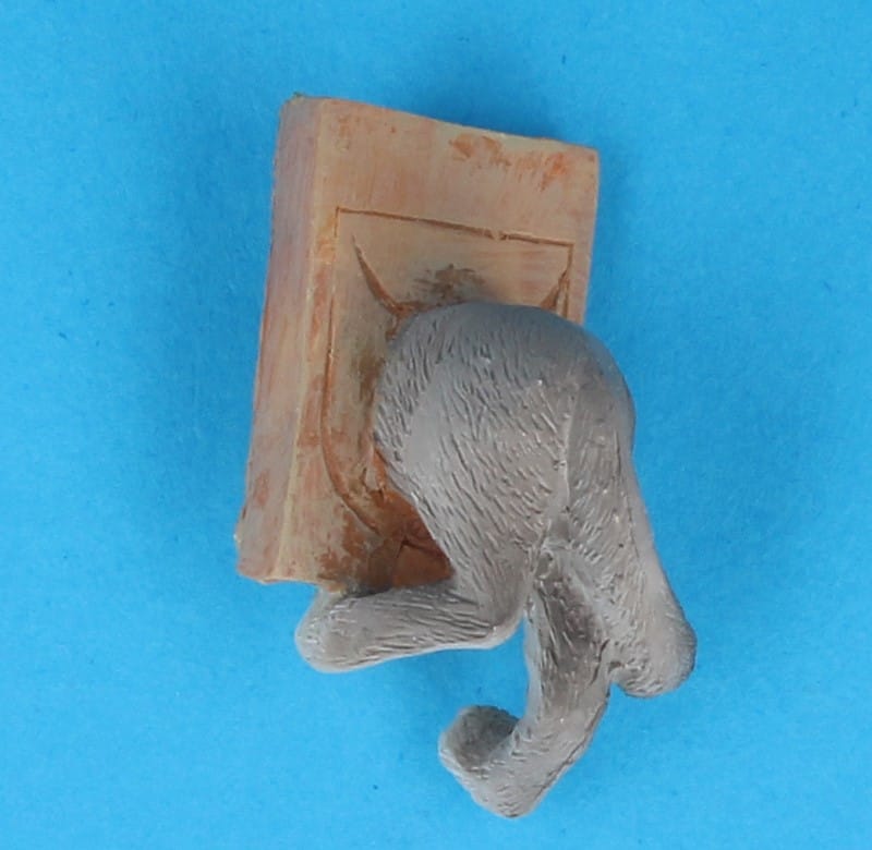 Chat faisant semblant d'entrer par un trou. C'est une figurine en résine qui ne montre que l'arrière du chat.
